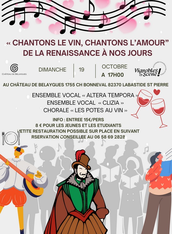 Les trois chœurs Altera Tempora, Clizia et les Potes au vin, vous invitent à passer une soirée en « bonne compagnie », à célébrer l’Amour et le Vin. En effet, messieurs Mozart, Purcell (et d’autres), sans oublier Madame Juliette ont composé une partie de la carte des vins. La palette des provinces de France d’où le répertoire populaire est issu, a fourni le reste. De « belles dames jolies » y côtoient des vignerons aux gros « sabiots », leurs doux amants en perdent l’appétit, pendant que des frères Grégoire s’endorment d’avoir quelque peu abusé …. Mais une petite messe solennelle » est quand même dite, pour le salut des ivrognes. Enfin, nous pouvons « Avec du vin, nous endormir » Voilà une belle soirée à partager, car l’amour comme le vin doivent être partagés ….