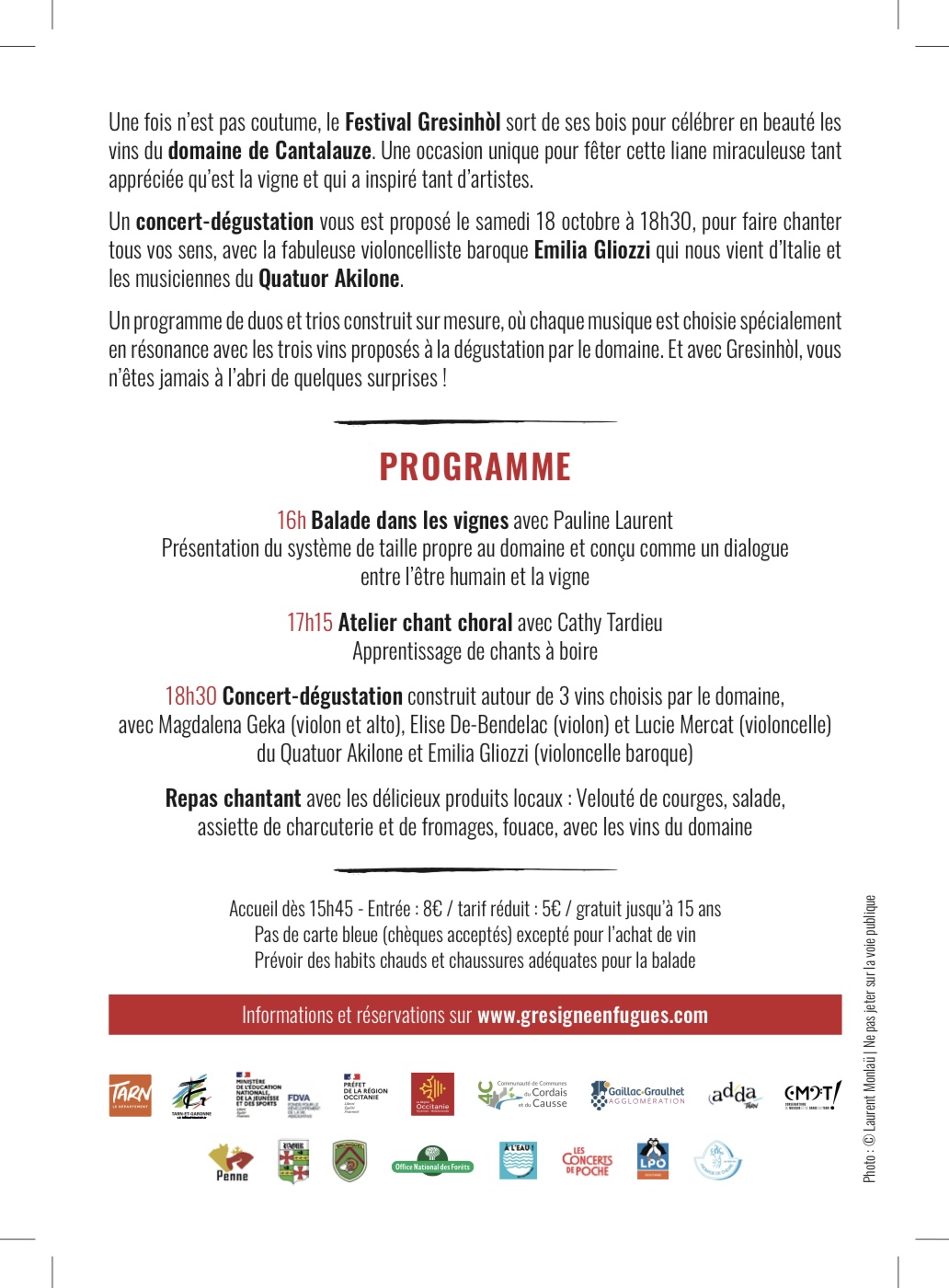 Une fois n’est pas coutume, le Festival Gresinhol sort de ses bois pour célébrer en beauté les vins du domaine de Cantalauze. Une occasion unique pour fêter cette liane miraculeuse tant appréciée qu’est la vigne et qui a inspiré tant d’artistes.