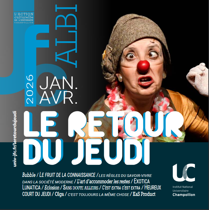 Le Retour du Jeudi, c’est le rendez-vous artistique hebdomadaire, gratuit et ouvert à tous, de l’action culturelle de l’INU Champollion sur le campus d’Albi. Éclectique et surprenante, la programmation alterne théâtre, rock, courts-métrages, chanson, marionnettes, hip-hop, clown, ciné-club, danse, slam, projections de documentaires, performances, etc.