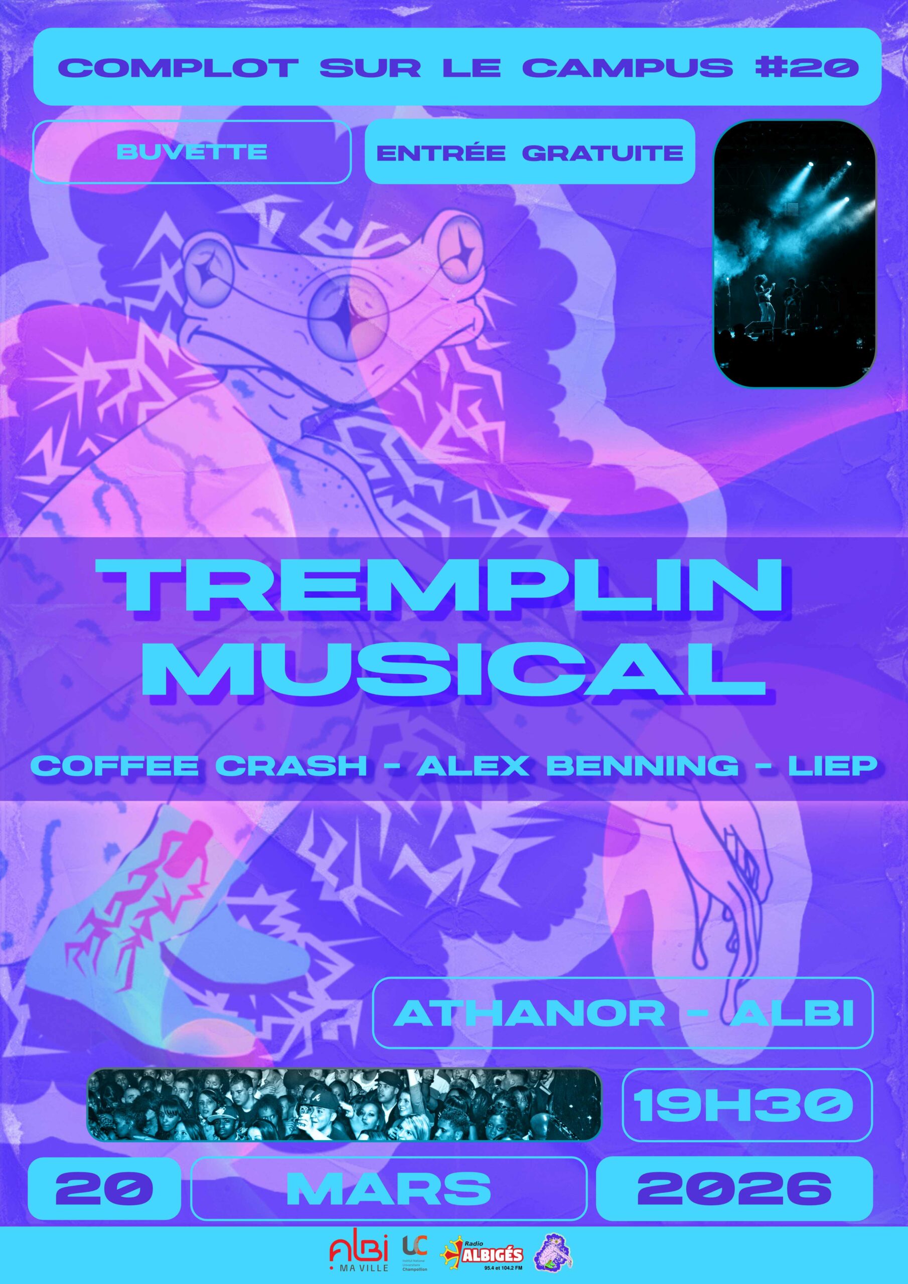 Les Comploteurs Festifs organisent leur tremplin musical afin de mettre en lumière la scène musicale locale ! Le gagnant se verra performer lors de l’ouverture de la 20ᵉ édition du festival Complot sur le Campus.